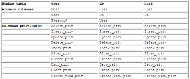 peticiones que impliquen tablas. Las tablas tables_priv y columns_priv proveen